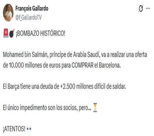 就在刚刚,一则重磅消息传来。根据西班牙多家媒体以及记者Gallardo带来的确切消息,西甲豪门巴塞罗那将有可能在接下来迎来巨大变革。因为沙特阿拉伯王子穆罕默德-本-萨勒曼准备出资100亿欧元将其收购,如果交易能在接下来顺利达成,这将是足坛历史性的时刻。